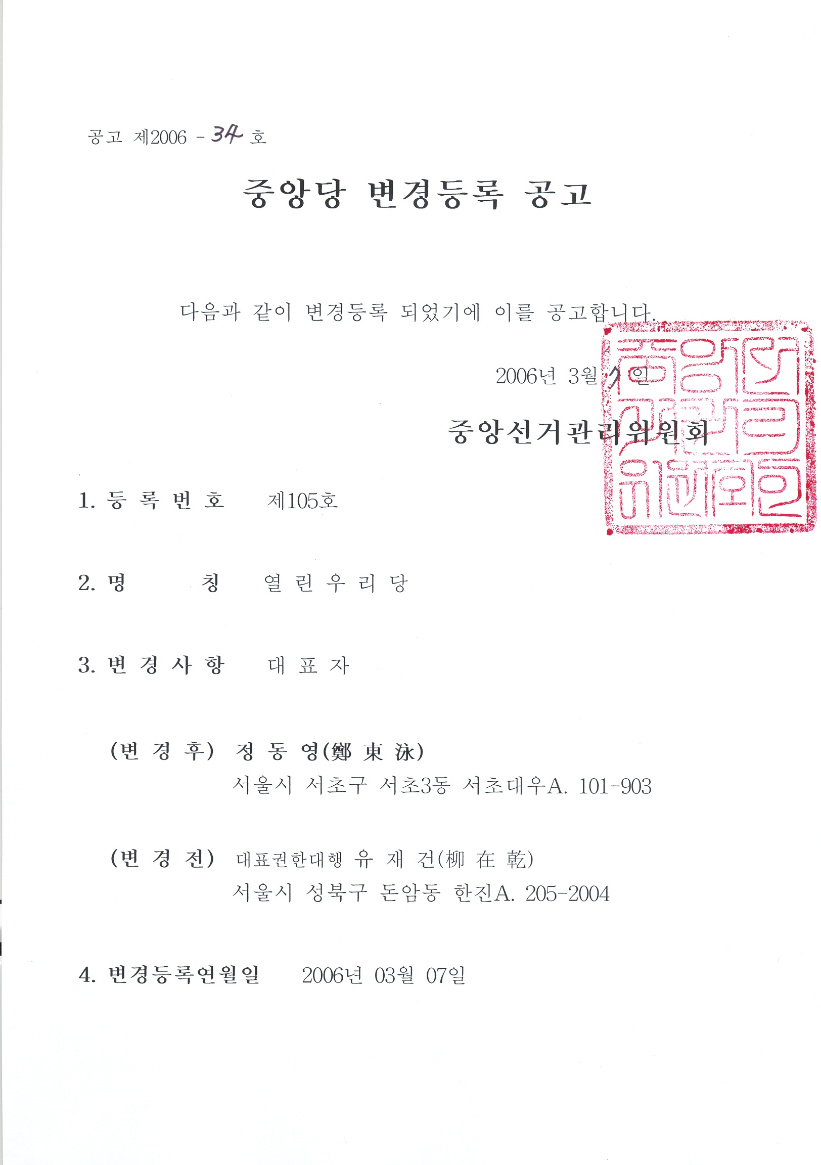 열린우리당 대표자가 변경등록되었기에 첨부파일과 같이 공고합니다.