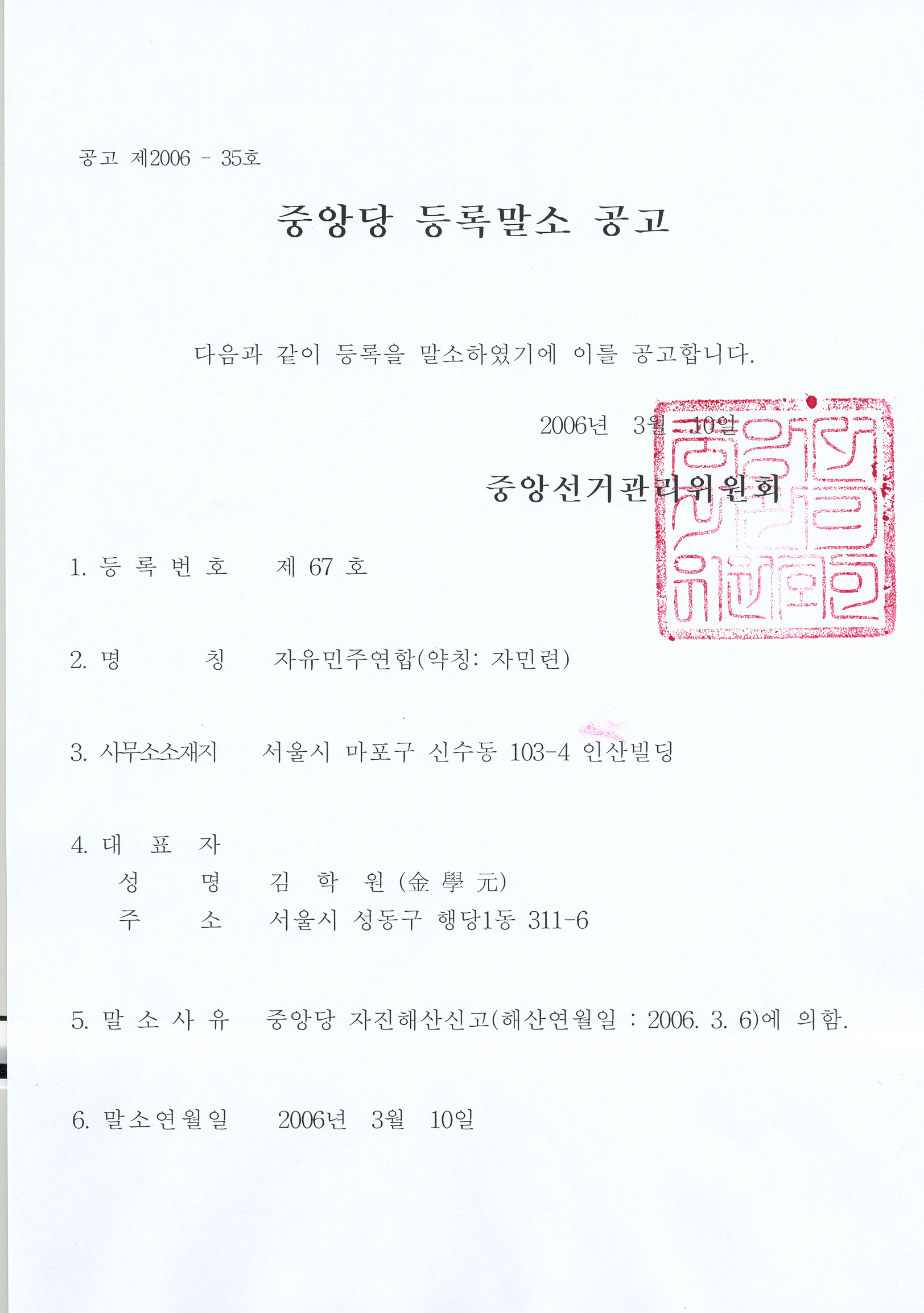 자유민주연합이 등록말소 되었기에 첨부파일과 같이 공고합니다.