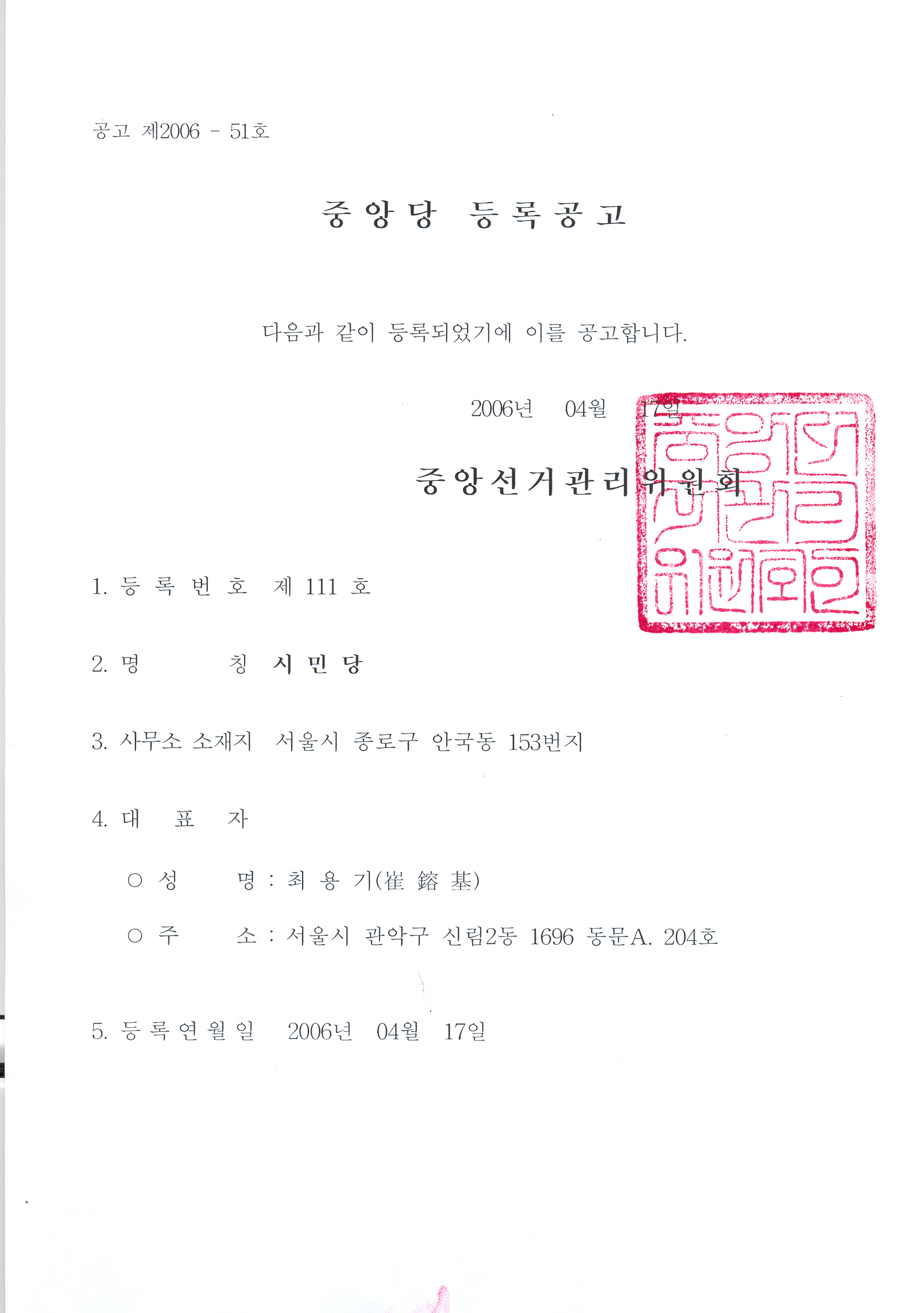 시민당 4. 17자로 중앙당등록 되었기에 첨부파일과 같이 공고합니다.