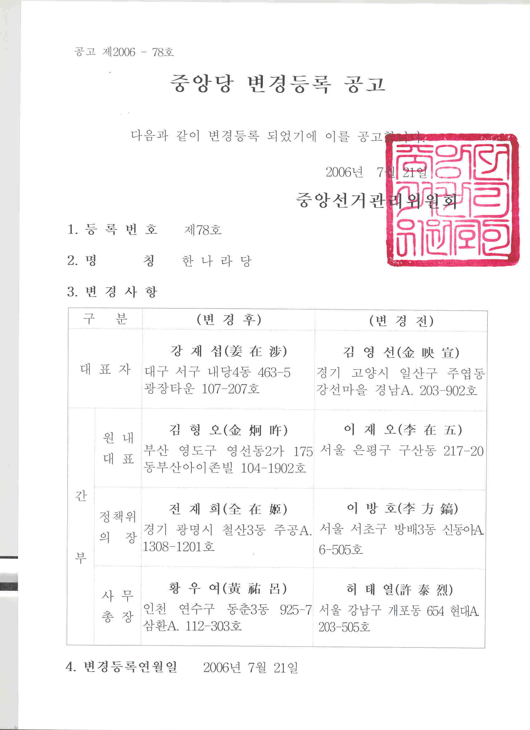 중앙당변경등록 공고(한나라당)