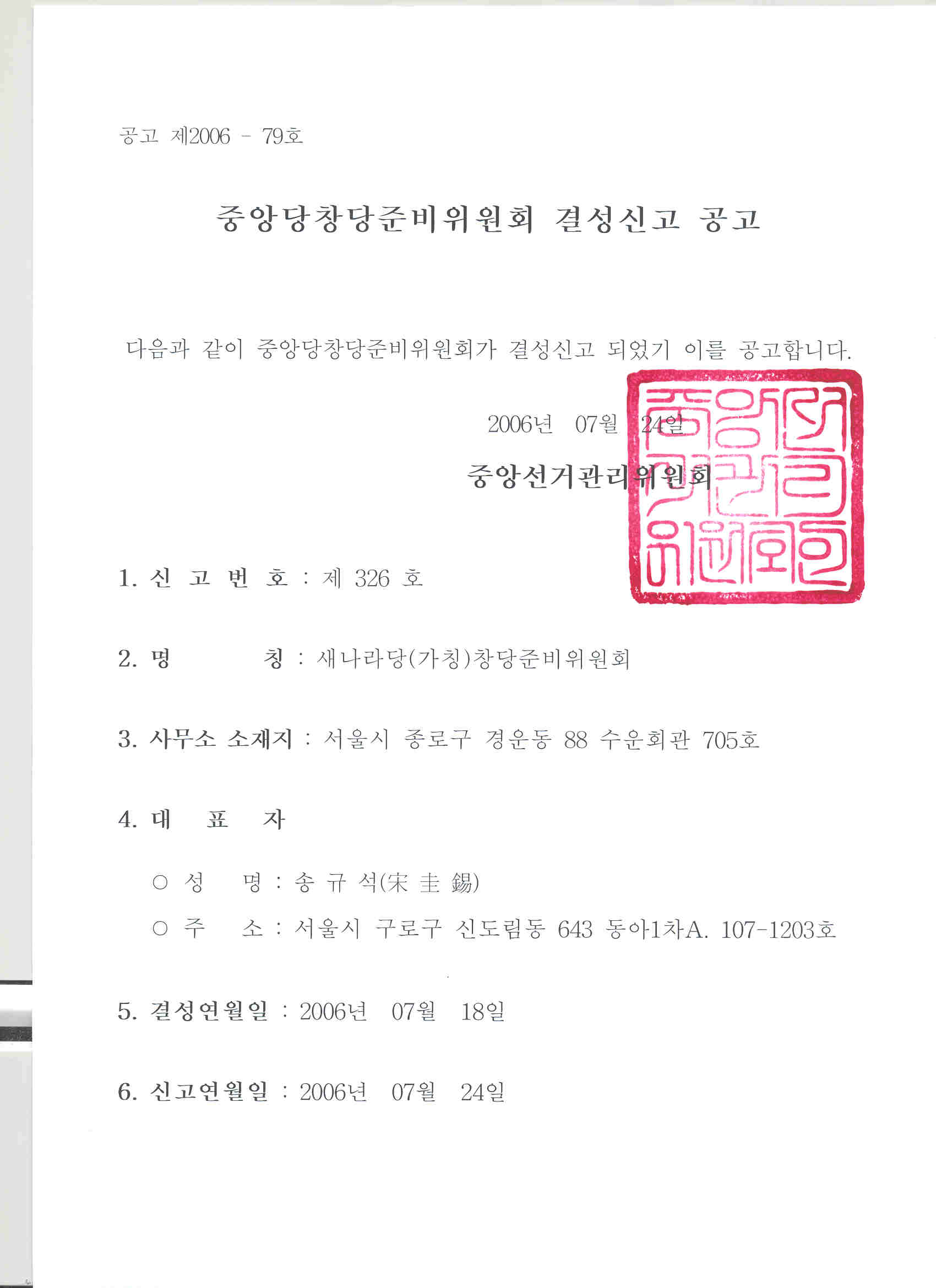 새나라당(가칭)창당준비위원회가 결성신고 되었기에 그 공고문을 첨부파일과 같이 게시합니다.