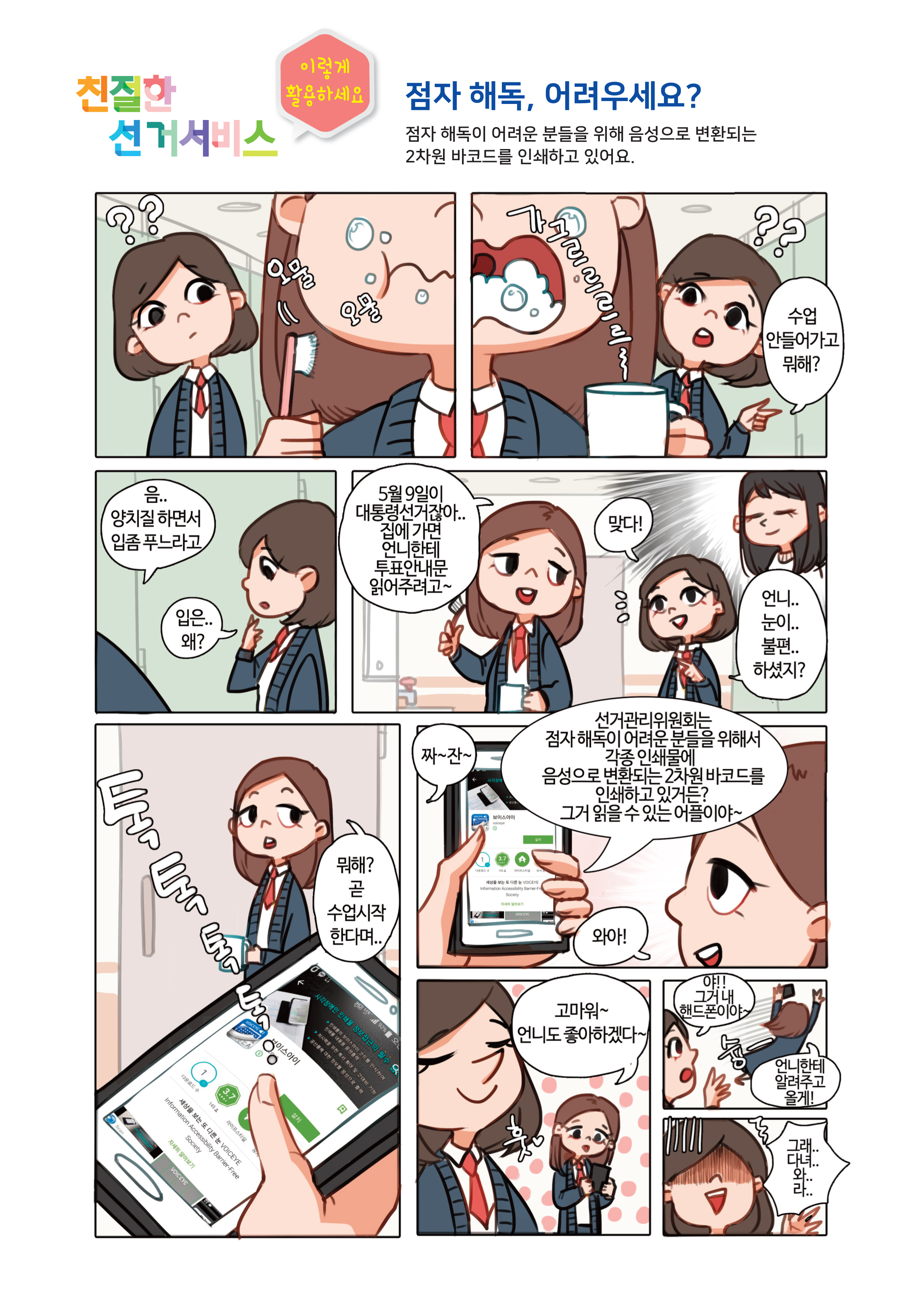 여1: 짜~잔~ 선거관리위원회는 점자 해독이 어려운 분들을 위해서 각종 인쇄물에 음성으로 변환되는 2차원 바코드를