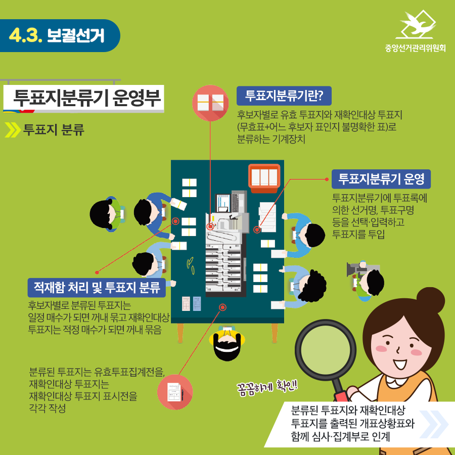 A : 투표지분류기에서 분류한 투표지는 개표사무원이 투표지심사계수기를 통해 전부 육안으로 다시 확인하여 투표지 혼입여부 등을 철저히 심사하고 있습니다.