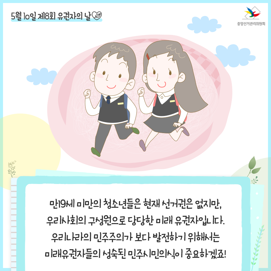 만19세 미만의 청소년은 현재 선거권은 없지만, 우리사회 구성원으로 당당한 미래유권자입니다.