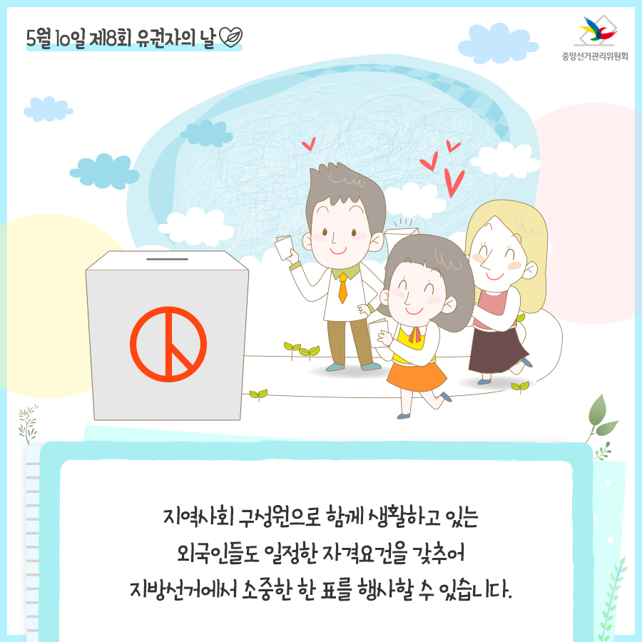 지역사회 구성원으로 함께 생활하고 있는 외국인들도 일정한 자격요권을 갖추어 지방선거에서 소중한 한표를 행사할 수 있습니다.