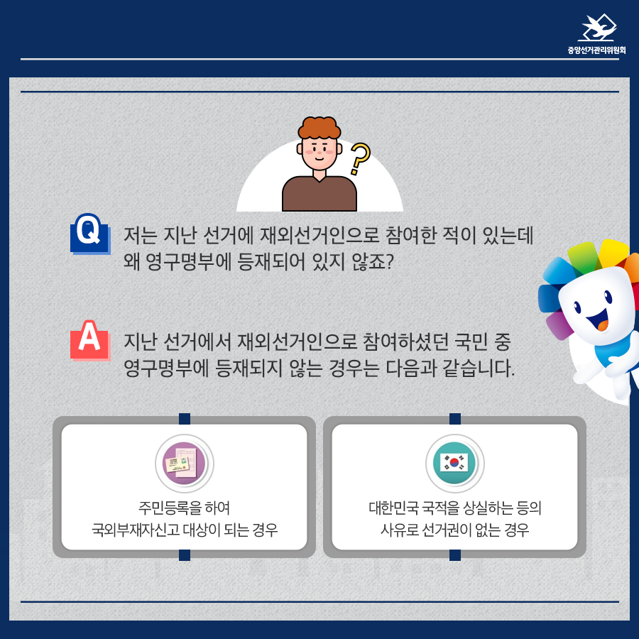 Q. 저는 지난선거에 재외선거인으로 참여한 적이 있는데 왜 영구명부에 등재되어 있지 않죠?