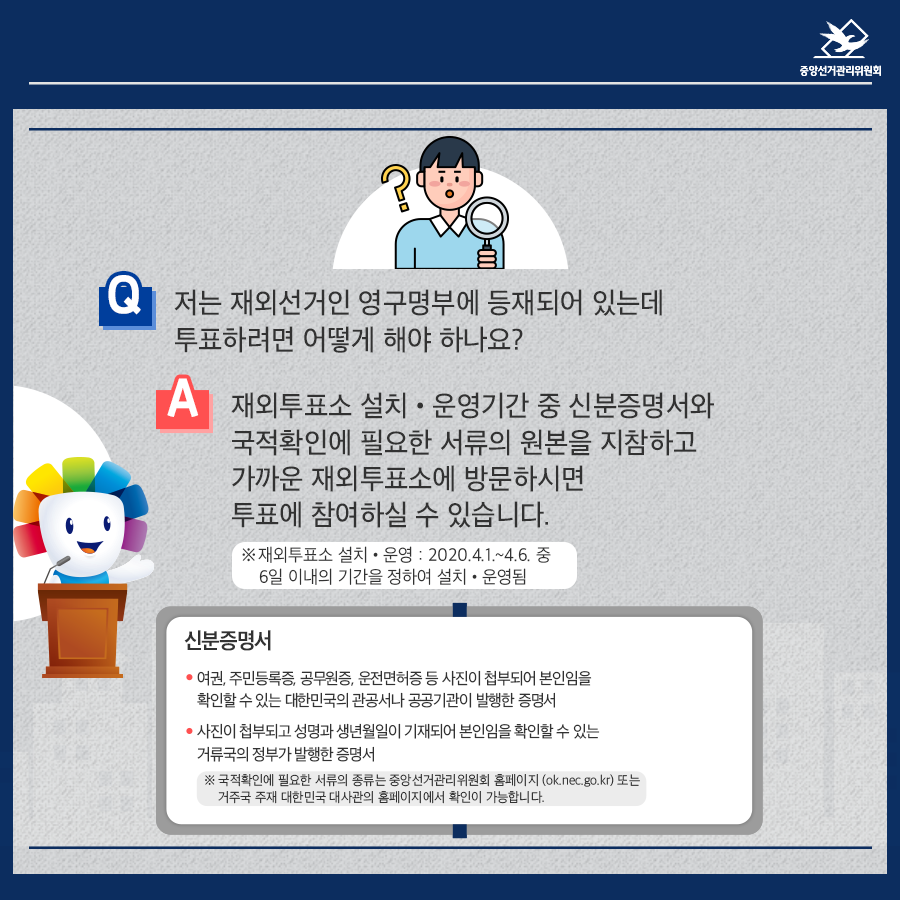 A. 재외투표소 설치운영기간 중 신분증명서와 국적확인에 필요한 서류의 원본을 지참하고