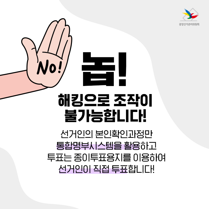 선거인의 본인확인과정만 통합명부시스템을 활용하고 투표는 종이투표용지를 이용하여 선거인이 직접 투표합니다!
