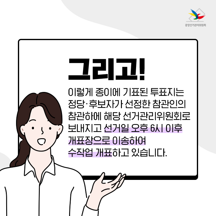 이렇게 종이에 기표된 투표지는 정당·후보자가 선정한 참관인의 참관하에 해당 선거관리위원회로 보내지고 선거일 오후 6시 이후 개표장으로 이송하여 수작업 개표하고 있습니다.