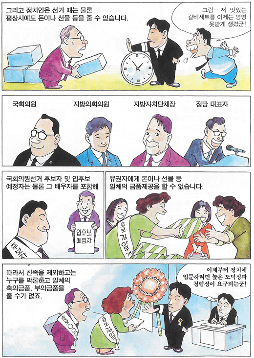 그리고 정치인은 선거 때는 물론 평상시에도 돈이나 선물 들을 줄 수 없습니다.