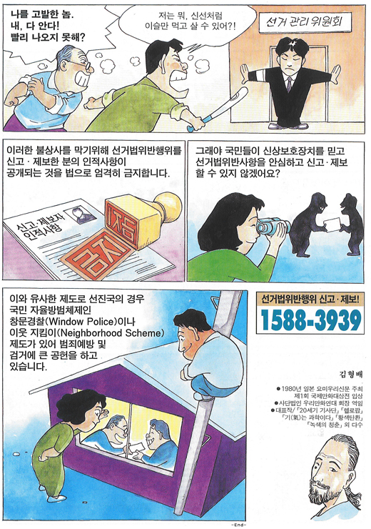 이러한 불상사를 막기위해 선거법위반행위를 신고. 제보한 분의 인적사항이 공개되는 것을 법으로 엄격히 금지합니다.